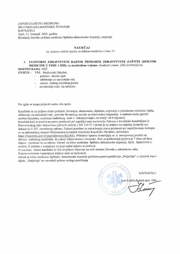 Natječaj za popunu radnih mjesta za doktora medicine u timu T1