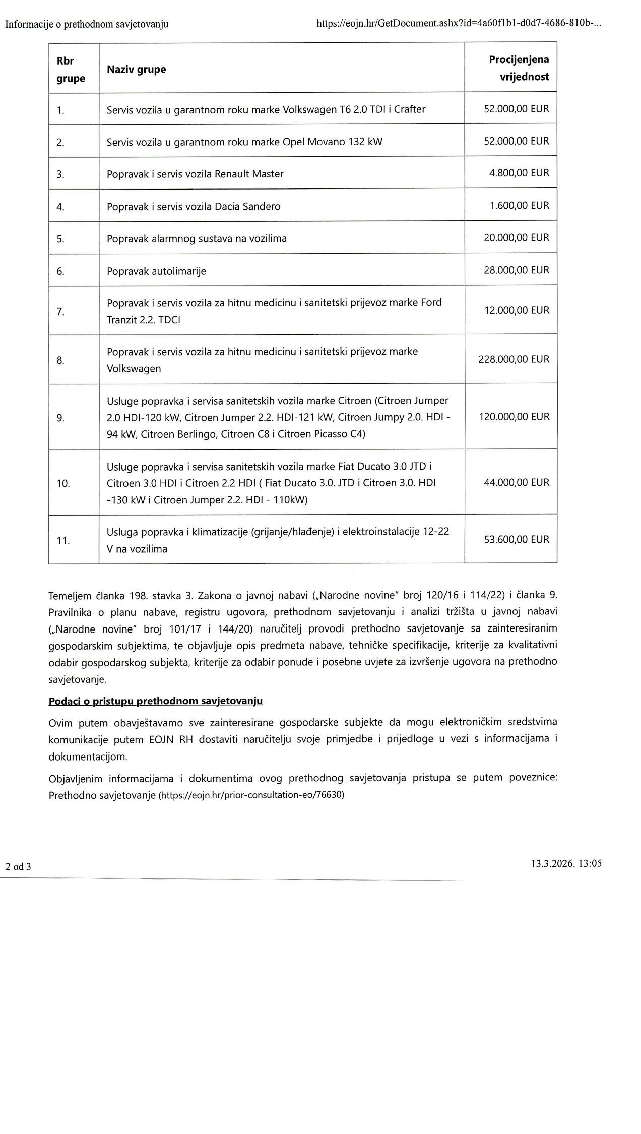 Sukladno odredbama članka 9. stavka 1. Pravilnika o planu nabave, registru ugovora, prethodnom savjetovanju i analizi tržišta u javnoj nabavi (Narodne novine, broj 30/23) naručitelj je opis predmeta nabave, tehničke specifikacije, kriterije za kvalitativni odabir gospodarskog subjekta, kriterije za odabir ponude i posebne uvjete za izvršenje ugovora objavio u EOJN RH u svrhu prethodnog savjetovanja sa zainteresiranim gospodarskim subjektima.