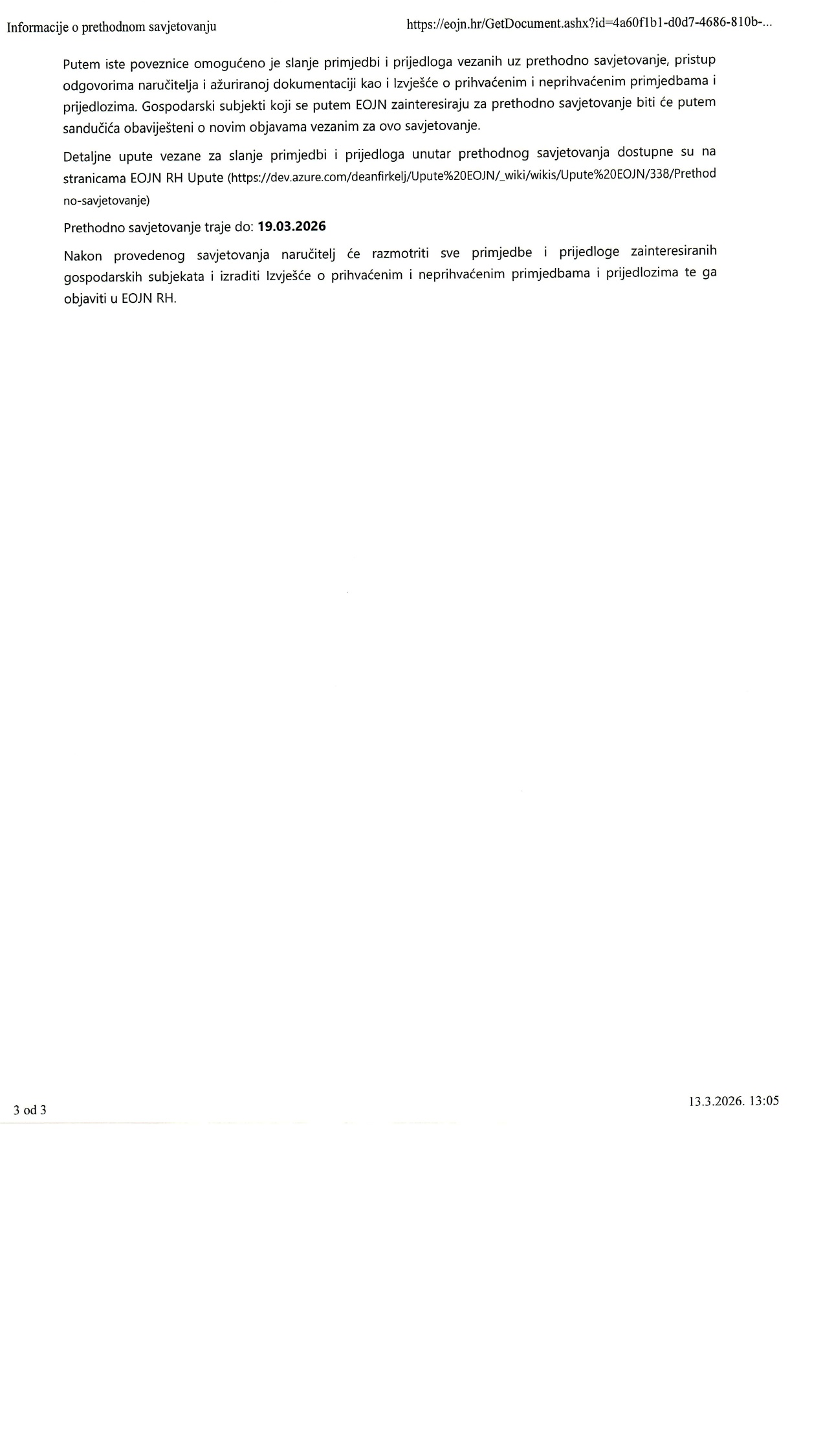 Za vrijeme trajanja prethodnog savjetovanja zainteresirani gospodarski subjekti komentare, prijedloge, mišljenja i sl. mogu dostaviti elektroničkim sredstvima komunikacije putem EOJN RH zaključno do 19. ožujka 2026. godine.